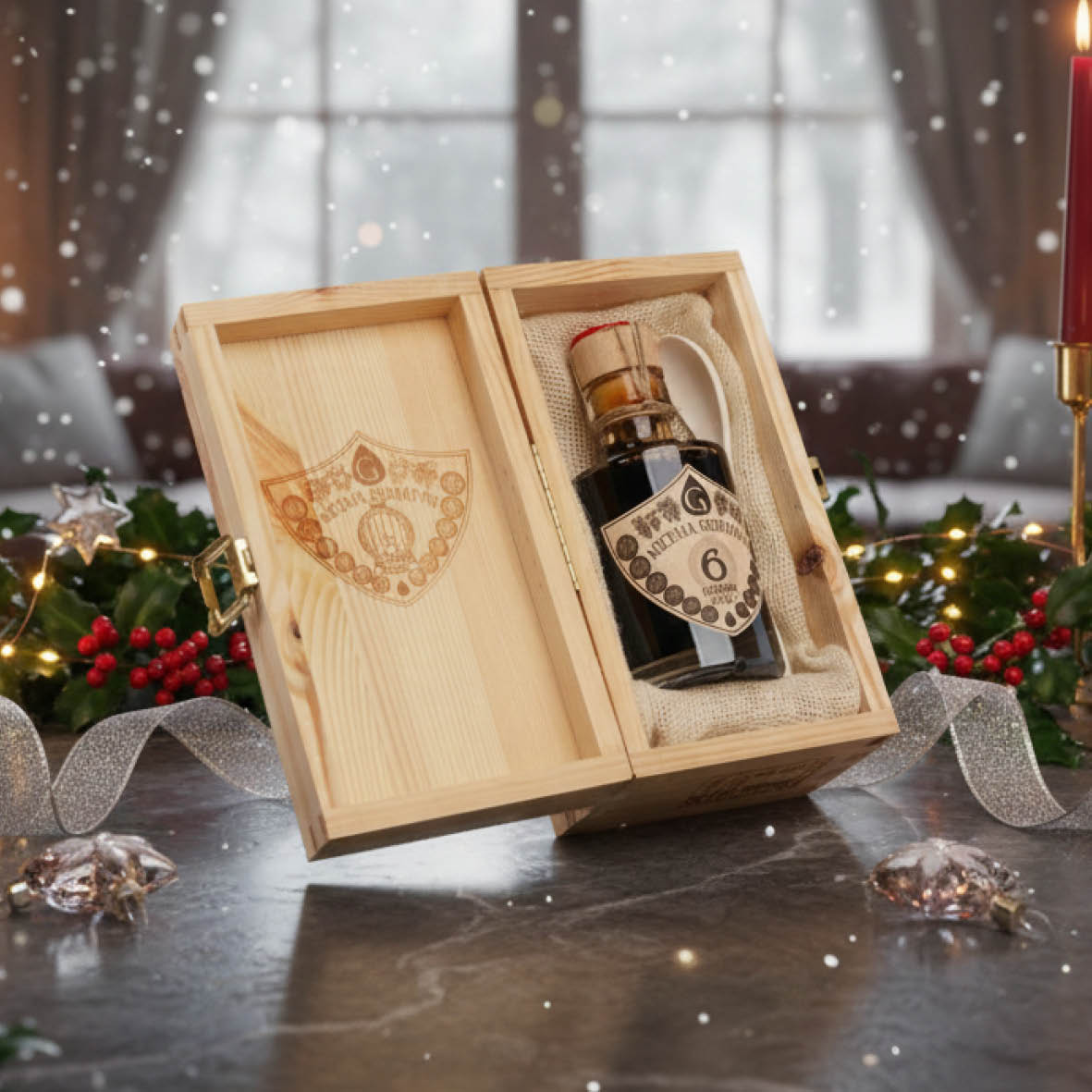 ESCLUSIVO CONDIMENTO BALSAMICO DI MOSTO D’UVA COTTO, ACETIFICATO E INVECCHIATO IN PREGIATE BOTTI DI LEGNO.