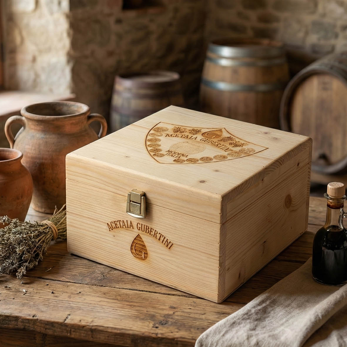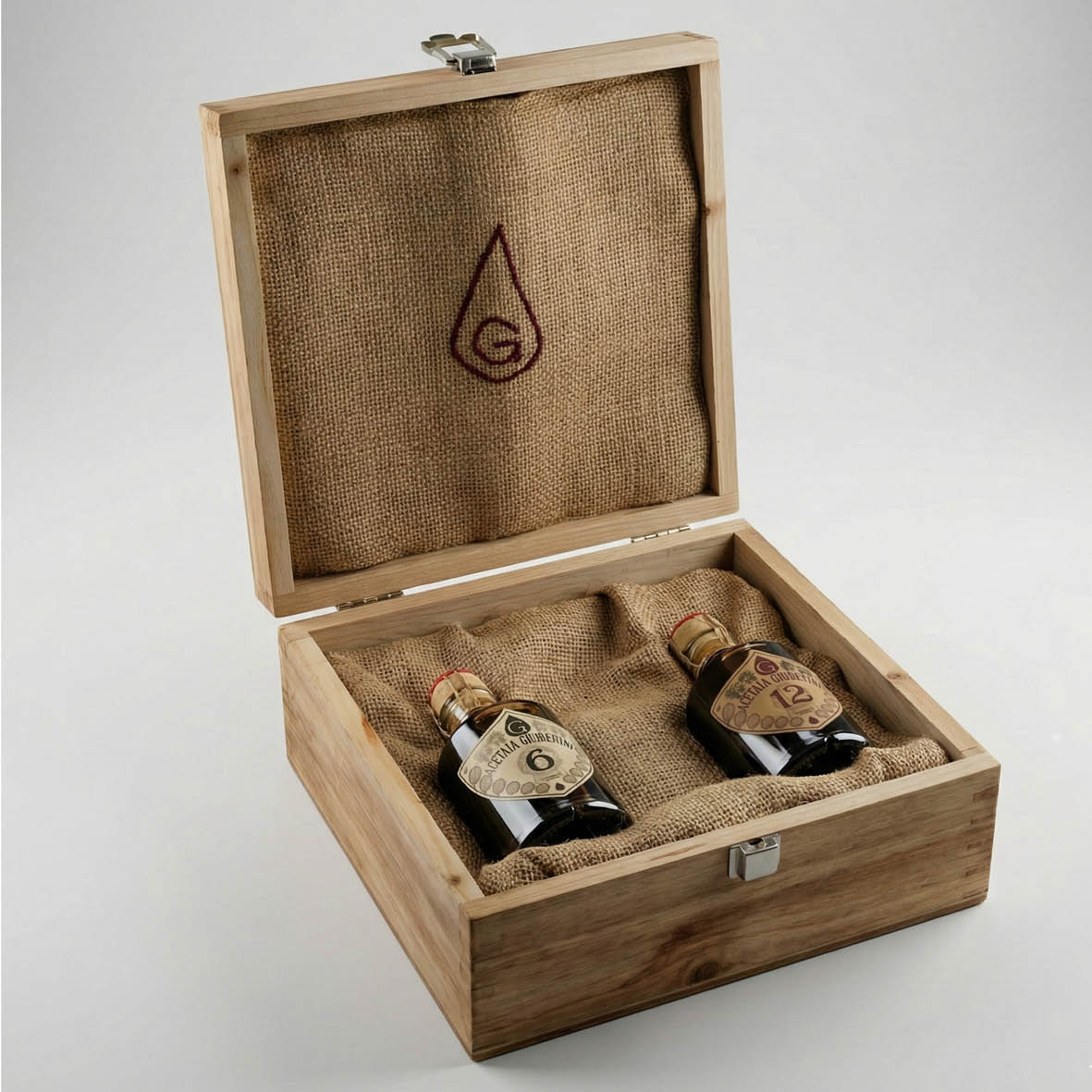 La Confezione  Premium 6 ANNI + 12 ANNI e’ un pregiato cofanetto in legno rifinito a mano con 2 bottiglie, una da 100ml di Gubertini  6 ANNI  e una di 100ml Gubertini 12 ANNI.